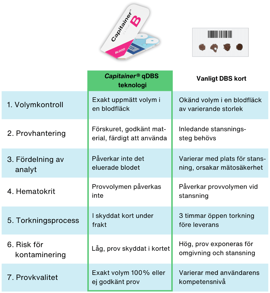 Användning av torkat blod inom diagnostik kallas för DBS från ”dried blood spot”. Capitainer kallar sin teknik för qDBS, då den torkar små blodvolymer med högre precision än traditionellt använda provtagningskort.